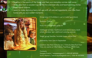 During the experience, you will experience the wild and pure Finnish nature with all five senses - taste, smell, touch, sight and hearing - while immersing yourself in a fairytale-like athmosphere. You will: